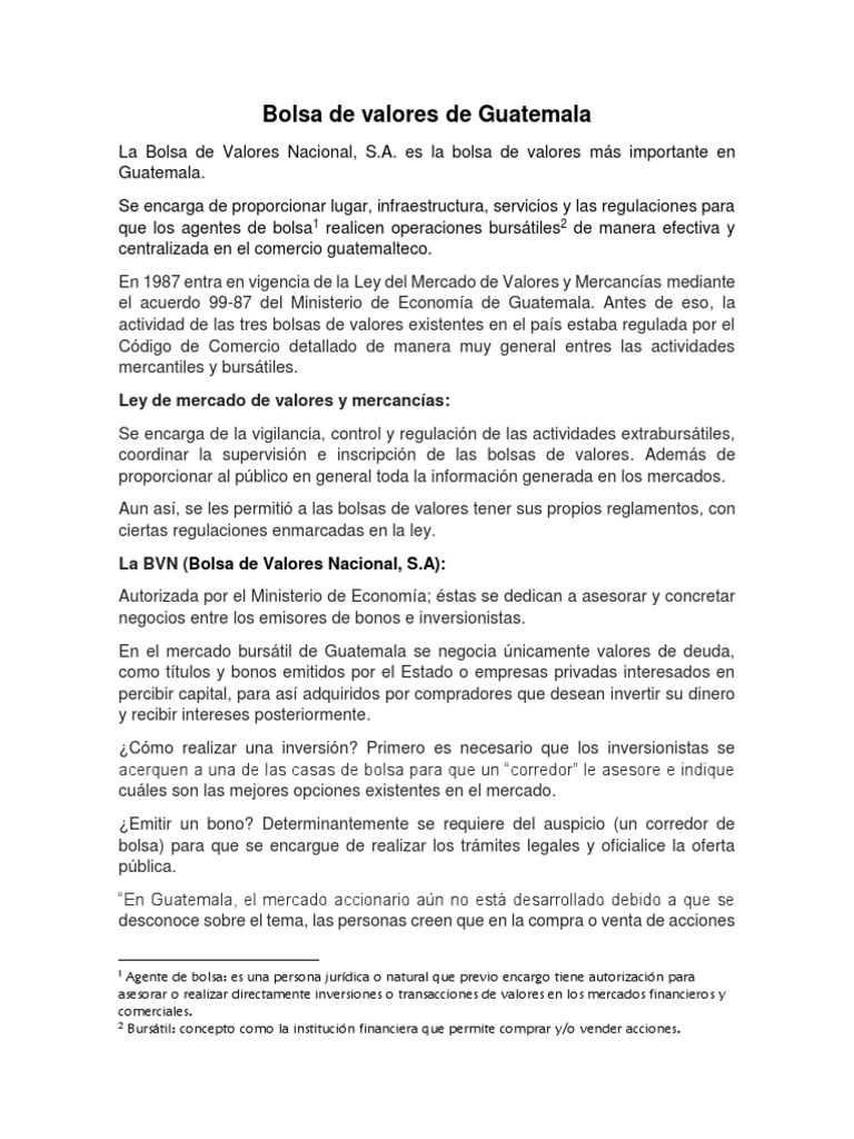 Fue establecida a finales del año 1987 y se. La bolsa de valores nacional, s.a. (bvn) es la bolsa de valores más importante de guatemala.