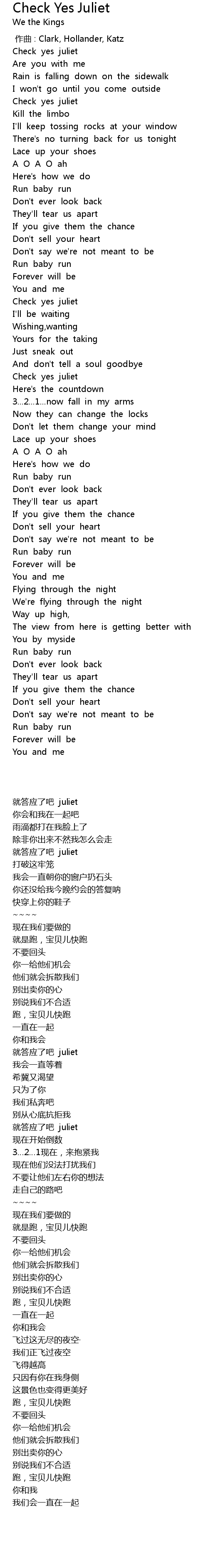 Check yes juliet lyrics performed by we the kings: Check yes juliet are you with me? The song is about young love and running away. Rain is falling down on the.