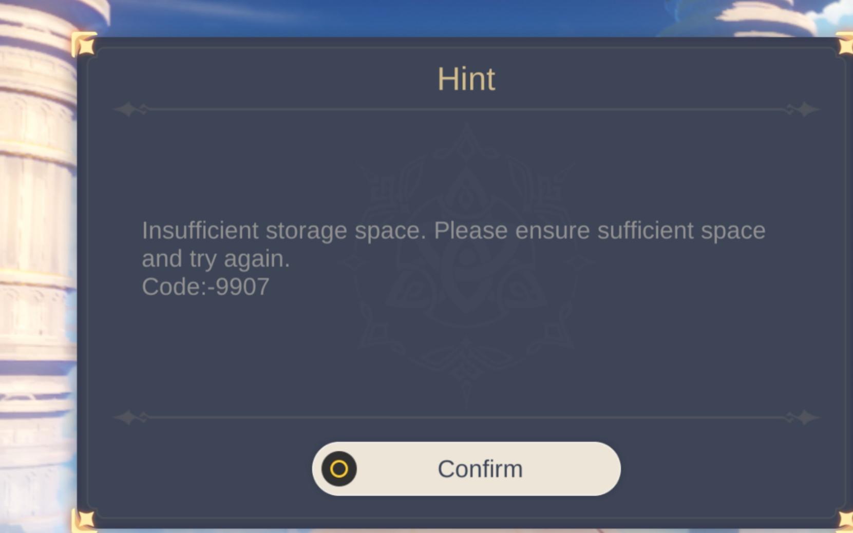 This means that the device that you are playing genshin impact on does not have enough memory in its system storage and that. Solutions to create more storage space and beating error code 9907 for playing genshin impact. If none of this is working, you. Not an expert, just guessing. Is your sd set up as internal storage?