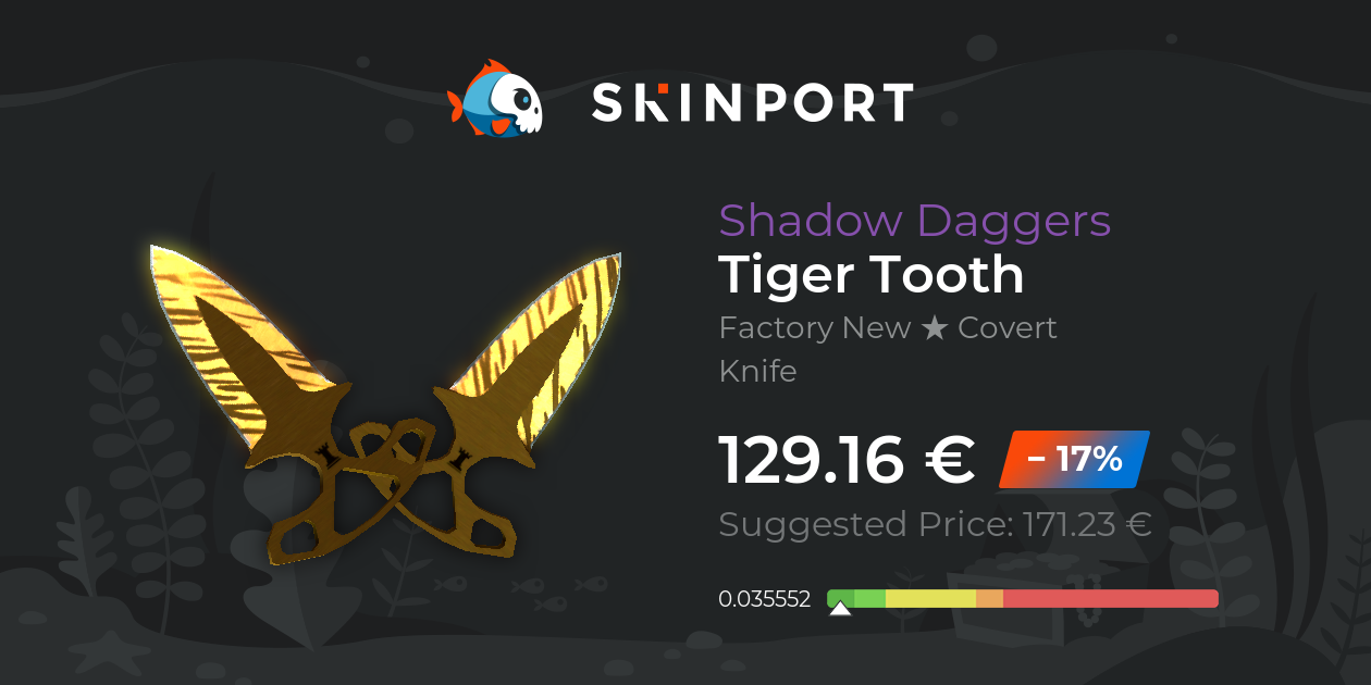 Shadow daggers | tiger tooth cs2 skin prices, market stats, preview images and videos, wear values, texture pattern, inspect. The skin has a stattrak option and belongs to the tiger tooth series. The float value of the ★ shadow daggers | tiger tooth ranges from 0 to 0.08, which makes the skin available in factory new and minimal wear. The.