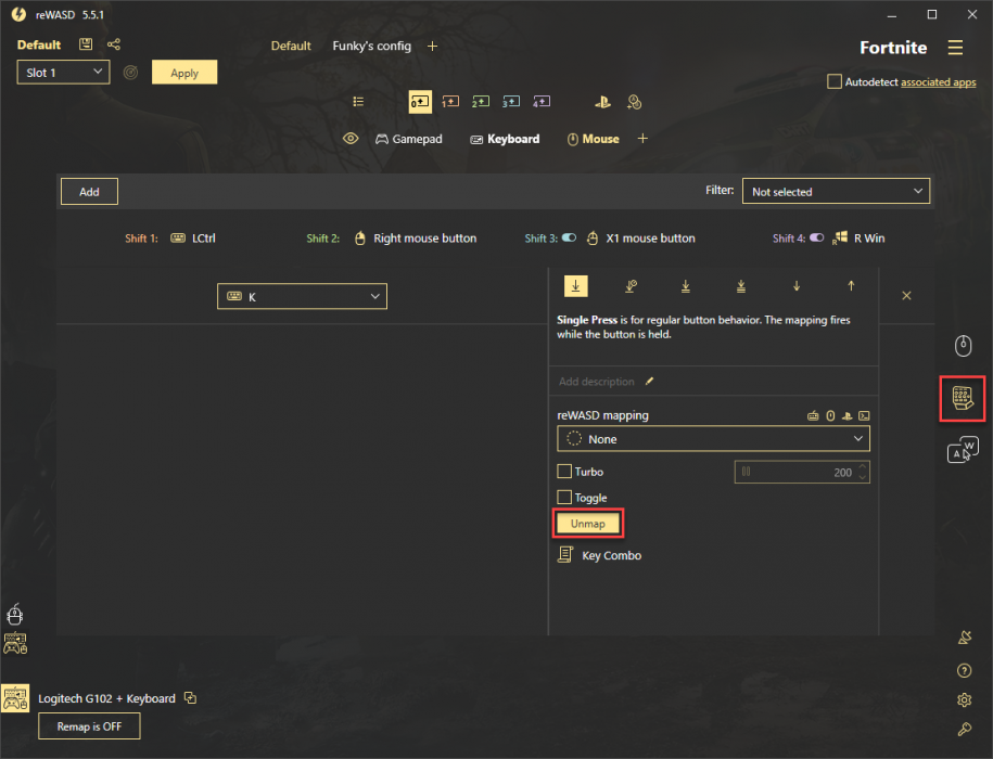 Hi guys, bought rewasd today and i've fallen at the first hurdle, if you can help i'd really appreciate it :) i'm configuring rewasd. Please go to single press activator, remove your combo and turbo and press unmap 2. Press (toggle) 23 key once and then hold down the. I'm using rewasd to have my mouse 4 button to spam e on my keyboard every 10ms and my mouse 5 button to spam f on my.