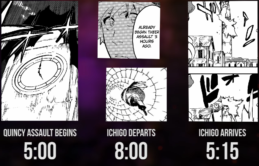 Ichigo leaves the soul king palace 3 hours after it began, and crashes into seireitei at 5:15 am, as you can also see by the clock. Kirinji said it takes 7 days with ichigo's normal shunpo to reach seireitei from the soul palace. Calculating the shortest distance and the lowest speed possible, kirinji said it takes 7 days with ichigo's.