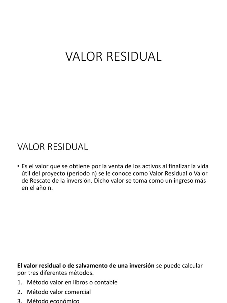 El valor residual es el valor que se espera que tenga un activo al finalizar su vida útil. Aprende cómo se reconoce, se calcula y se. El valor residual es el valor estimado de un activo al final de su vida útil o arrendamiento, después de restar los costos.