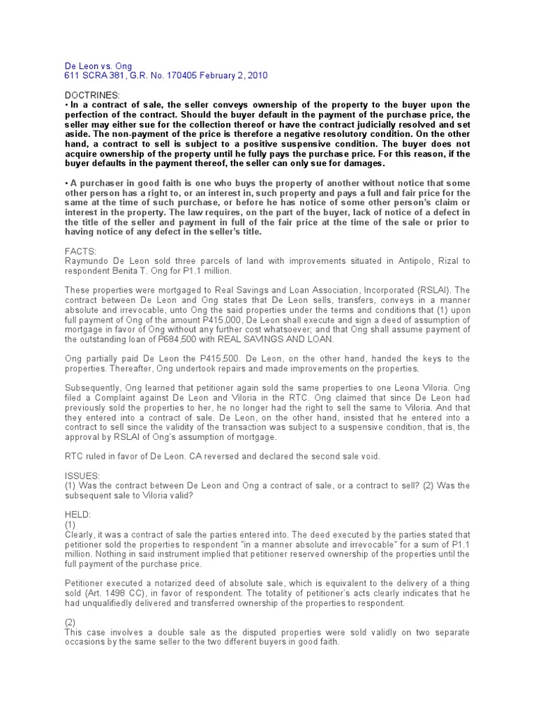 05 DIGEST G.R. No. 170405 DE LEON vs. ONG (2010) PDF Deed Prices